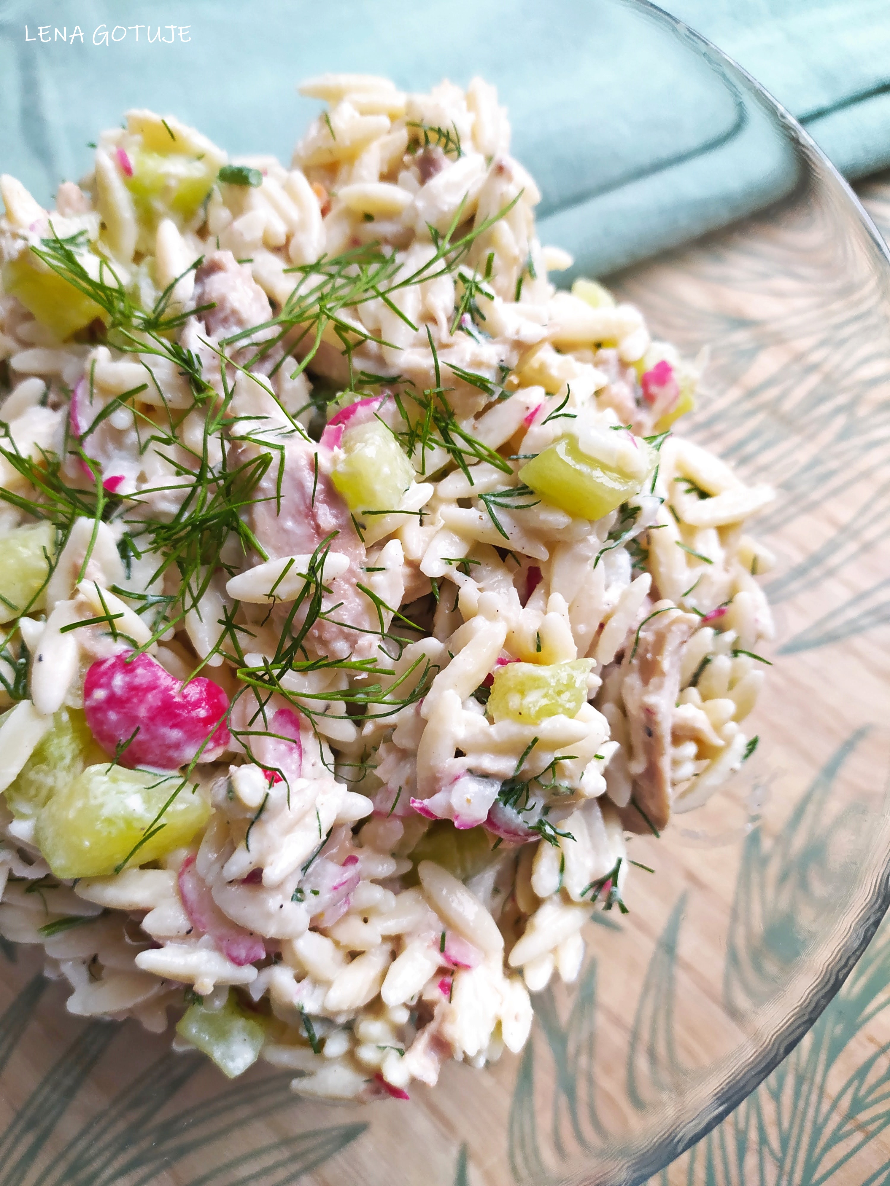 Sałatka z makaronem orzo, kurczakiem pozostałym po gotowaniu rosołu, z dodatkiem ogórków zielonych, rzodkiewki i dipu koperkowego.