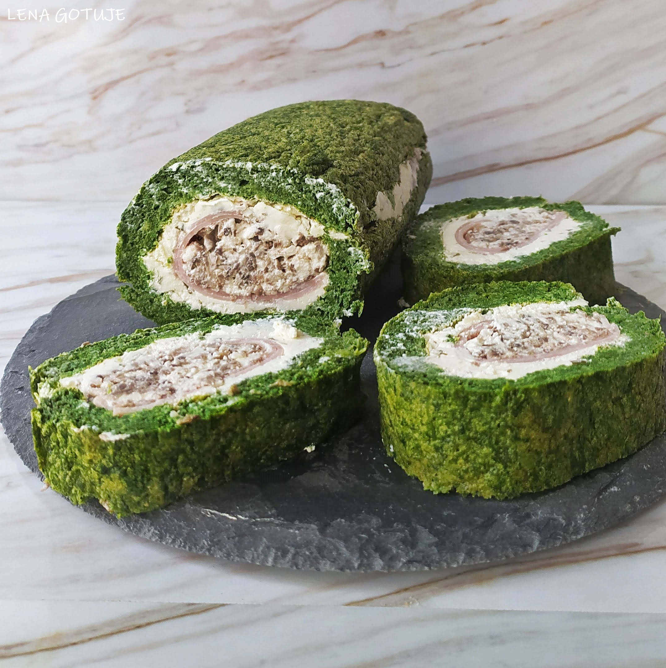 Zielona rolada ze szpinaku z pieczarkami, serem buratta, szynką. Świetnie sprawdzi się na świątecznym i imprezowy stole, ale także jako przekąska na co dzień.